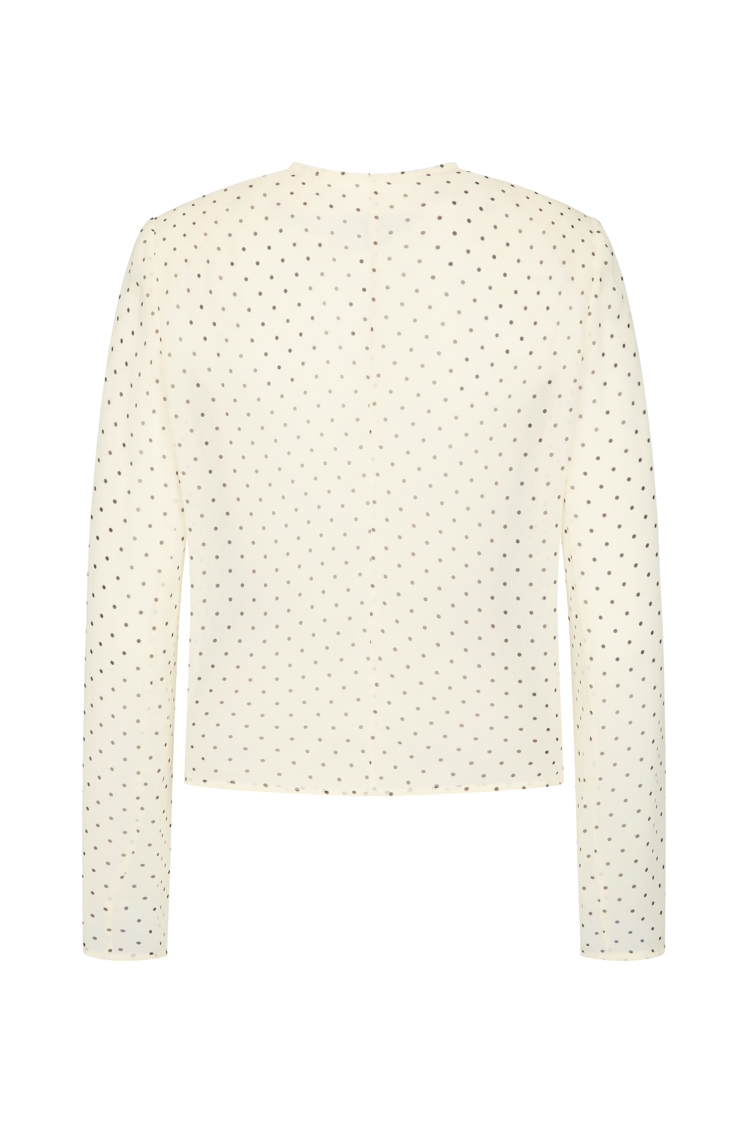 A cropped, long sleeve button-front blouse cut in sheer cream silk georgette with black polka dots. Subtle removable shoulder pads lend quiet structure to the fluid silhouette, while the collarless neckline offers paired back elegance.