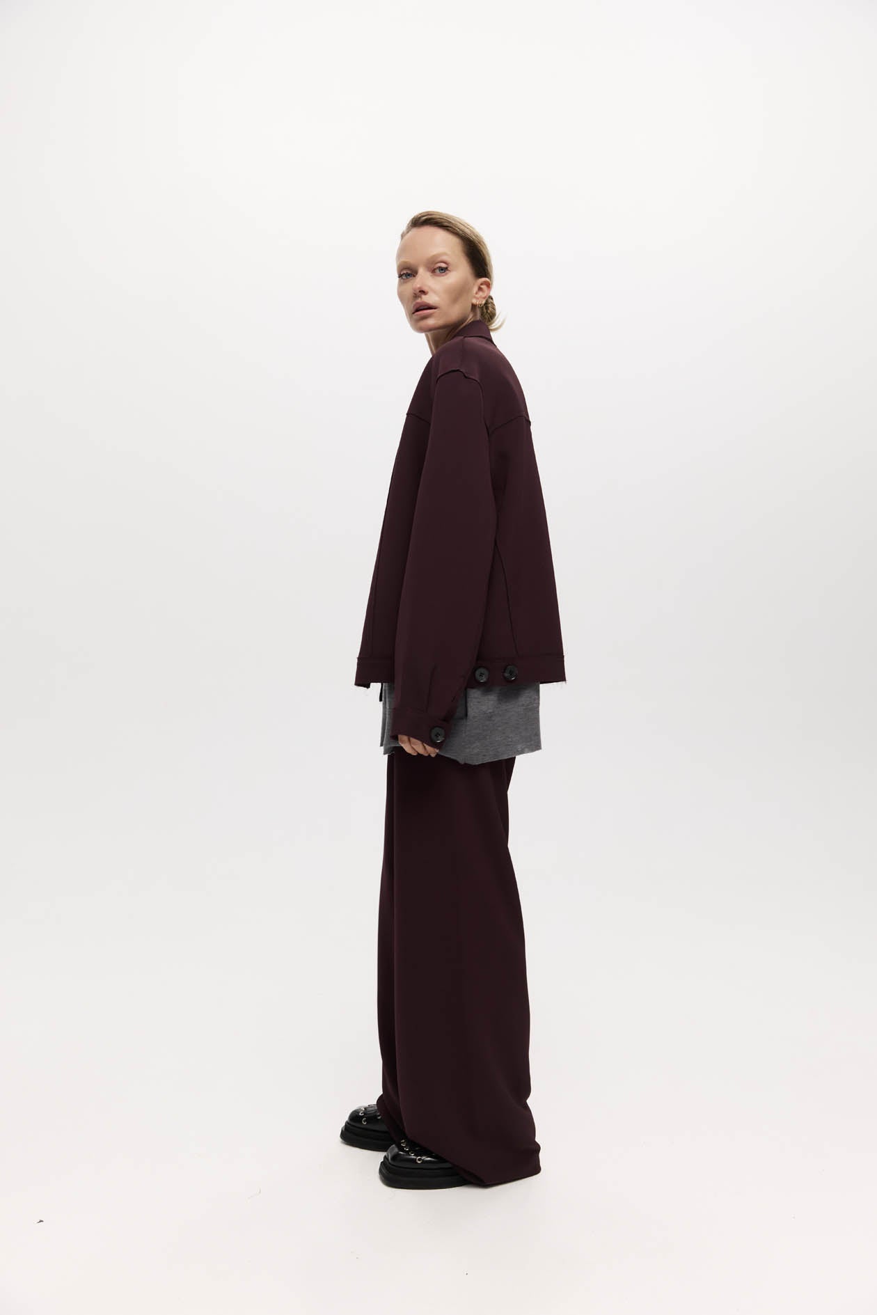 A relaxed cut in structured bark bonded suiting. Referencing western menswear. Cut for a subtly oversized fit, with raw edge detailing and horn buttons.