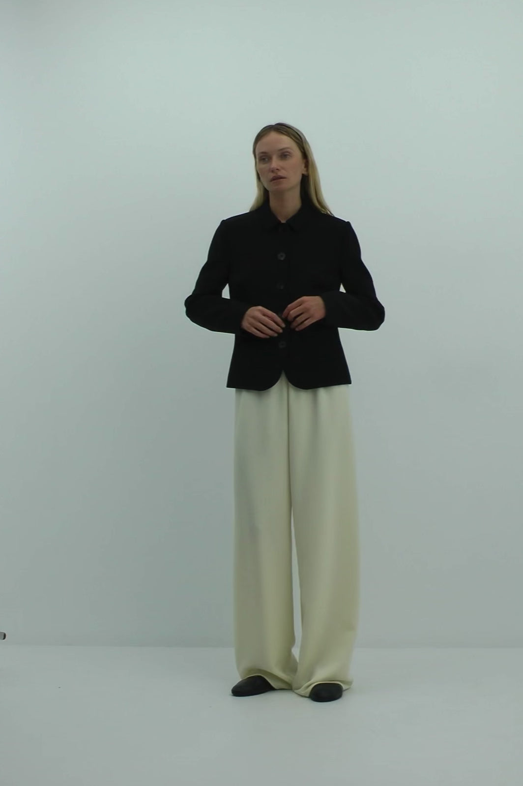 Bardot blazer in black bonded suiting features a pointed collar, five-button closure, and front jet pockets. A contoured fit through the waist, referencing '50s tailoring. Fully lined.