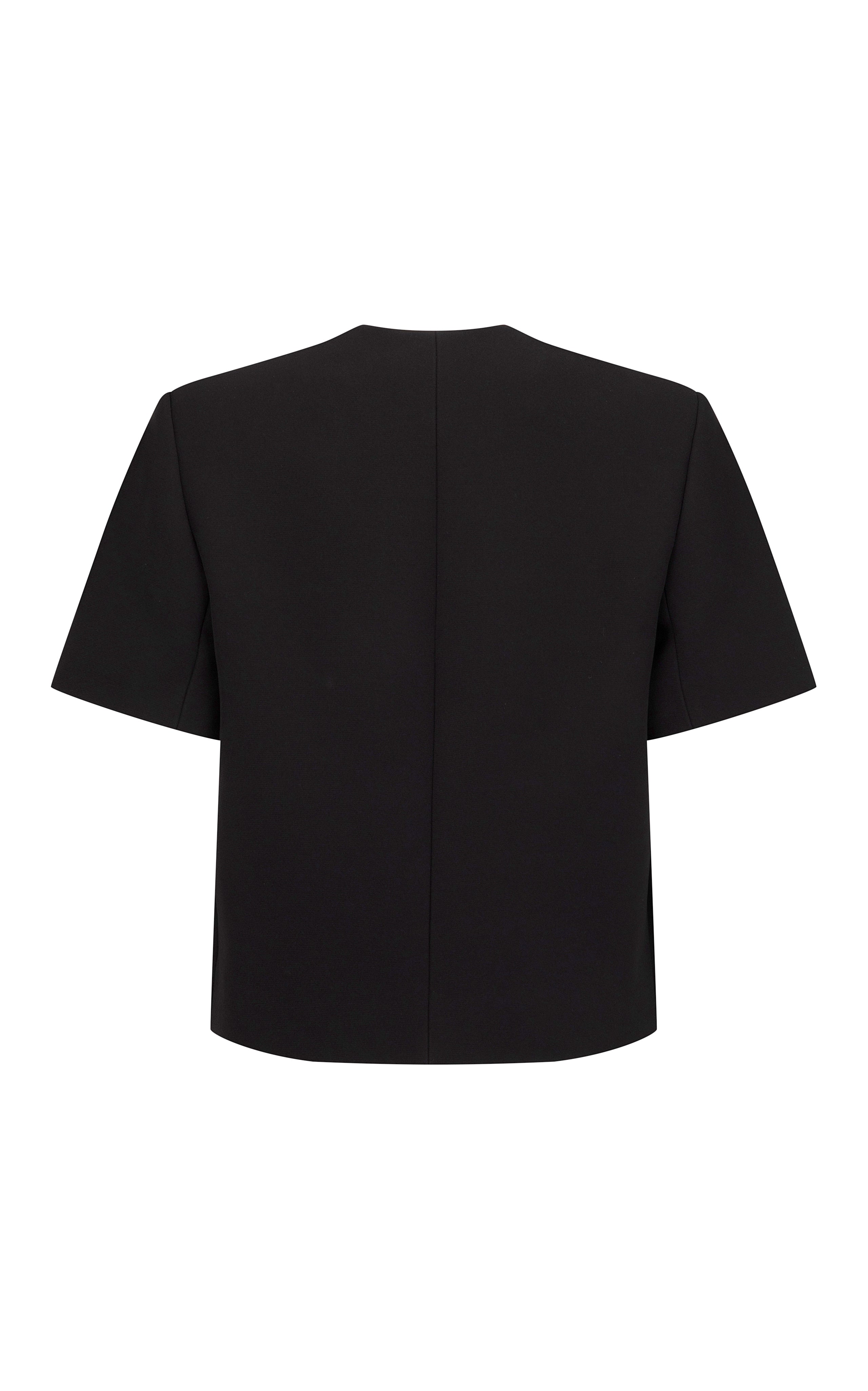 A collarless cropped jacket. Fully lined and designed with '50s and '60s tailoring references in mind. Cut in black bonded suiting.