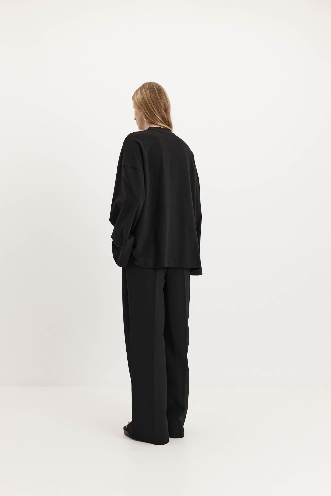 The aspirational meets the everyday. Cut in brushed cotton with a suede-like hand-feel. Drop shoulders and long sleeves are intentionally designed for an oversized fit.