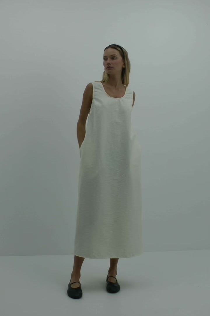 Crafted from cream textured cotton, this sleeveless style features a pared-back silhouette with a subtle cocoon shape that drapes away from the body. Designed for heat and light, it invites the wearer to feel both free and refined. Finished with side pockets for everyday wear.