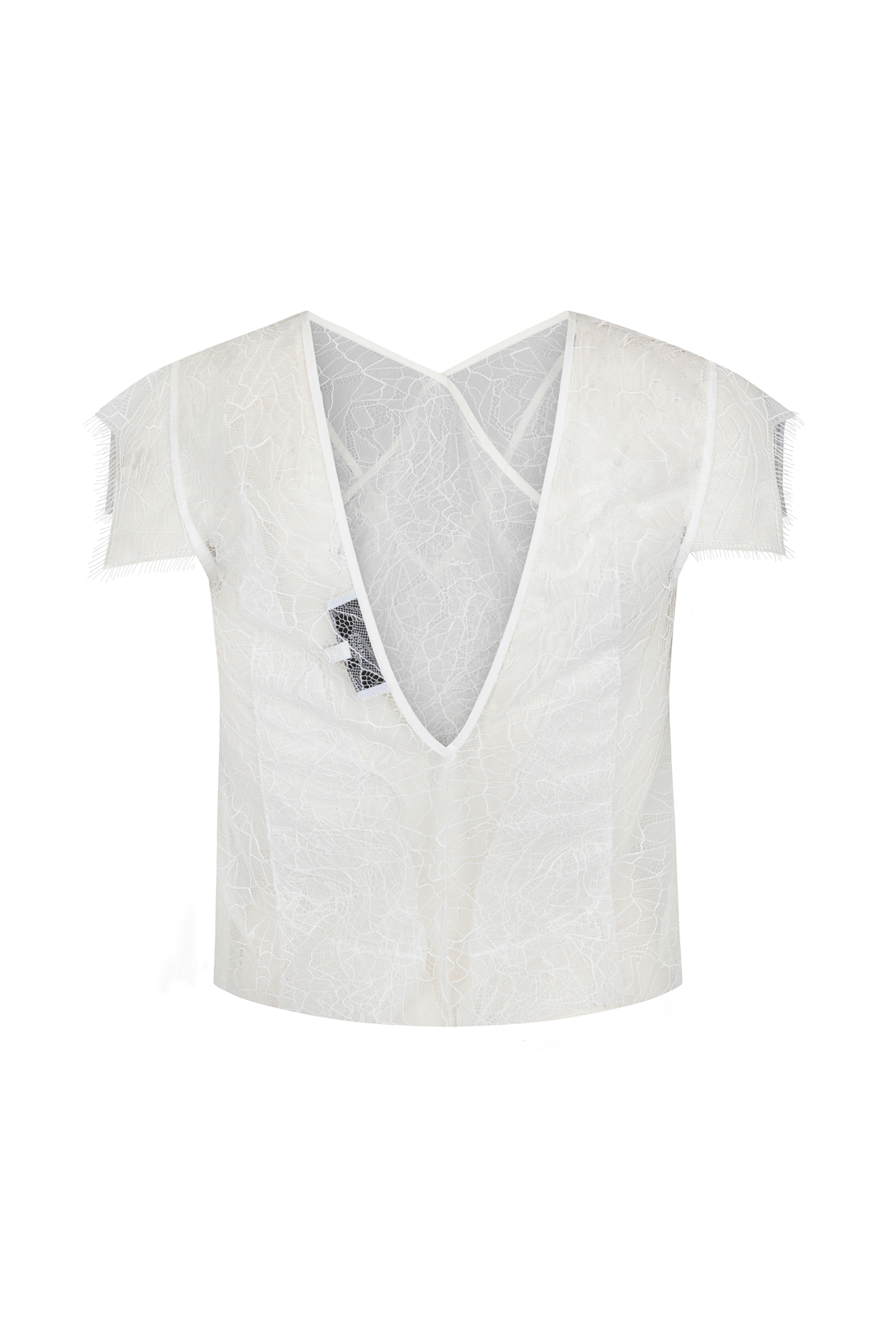 A sheer white lace top with a cropped and fitted silhouette. Two front panels cross high at the neck, while a subtle scalloped cap sleeve frames the shoulder. Features a side zip and visible front and back darts to sculpt the silhouette.
