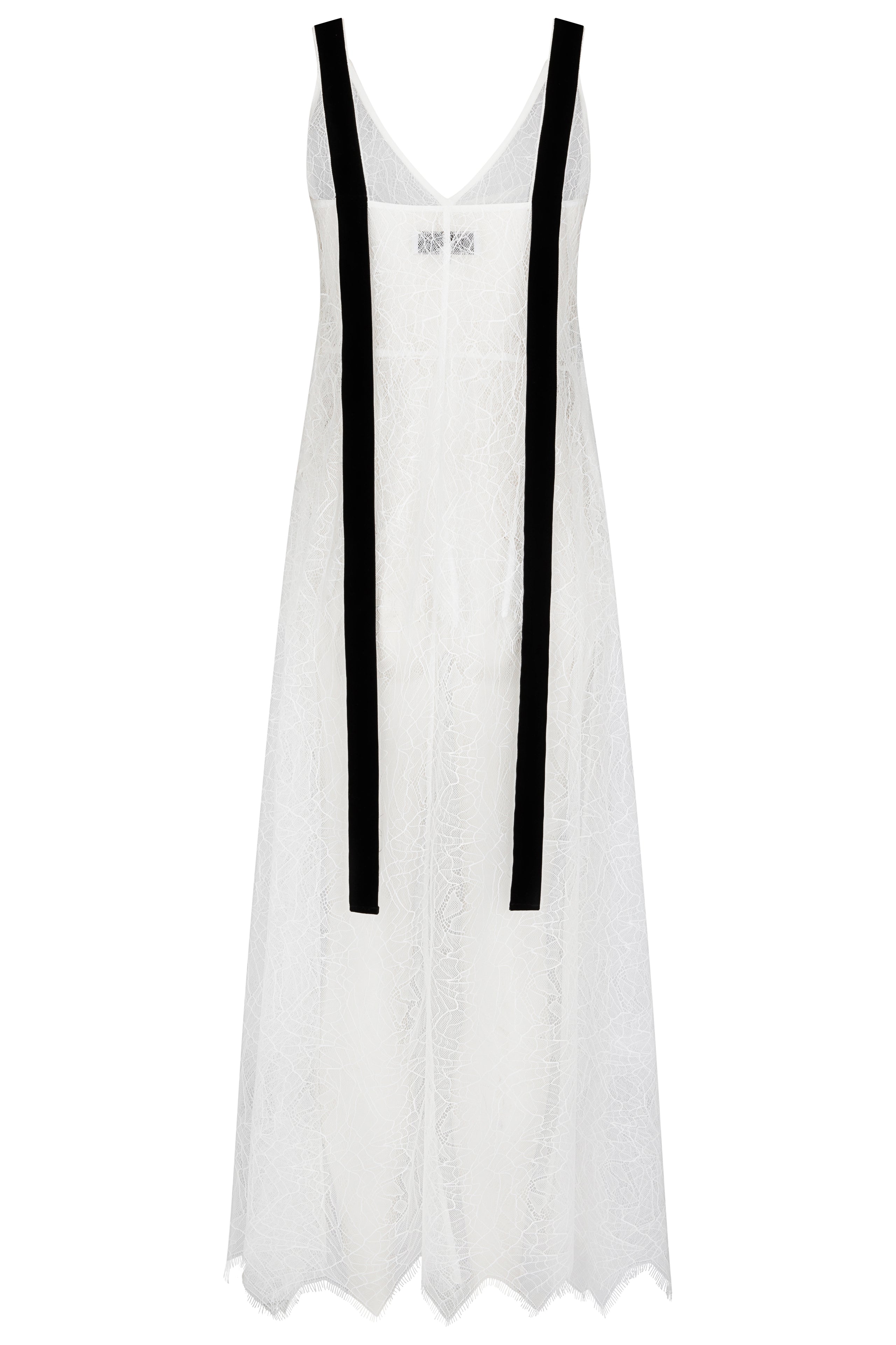 A sleeveless dress cut in sheer white lace with a V-shaped neckline. The bodice features a second layer, which flares high on the waist and falls delicately over the calf length skirt. Black velvet ribbon overlays form the straps, draping fluidly from each shoulder. Features a side zip closure and scalloped hems.