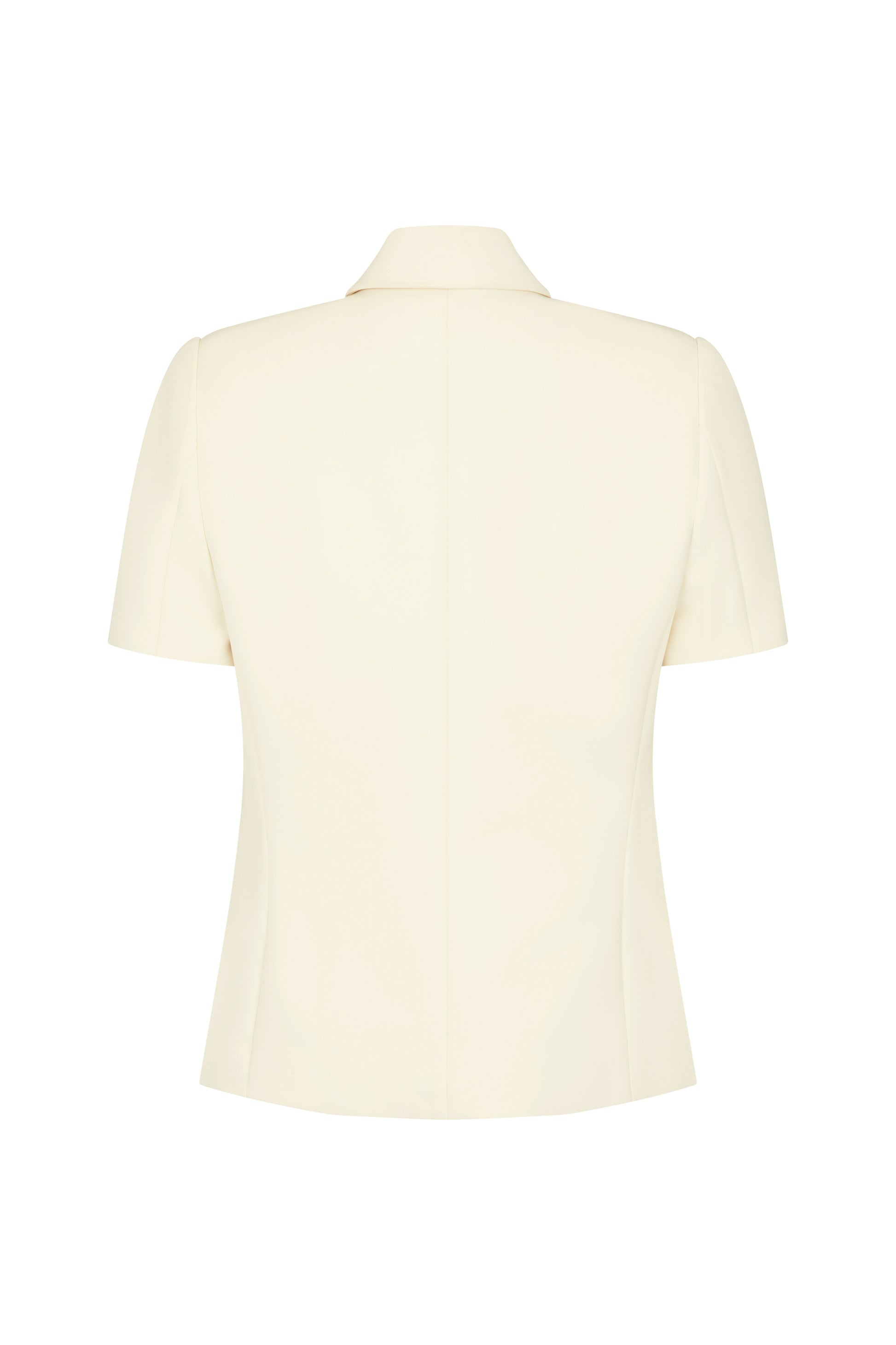 A short sleeve blazer with pointed collar, five-button closure, and front jet pockets. Fit is contoured at the waist, referencing '50s tailoring. Fully lined