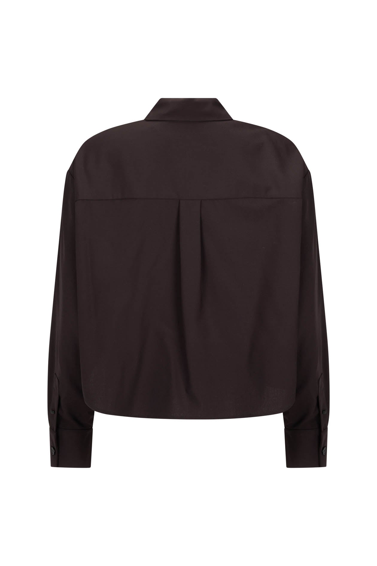 Cropped shirt in plum wool suiting with a pointed collar, concealed button placket, and structured cuffs. Features a boxy silhouette with an extended back hem.