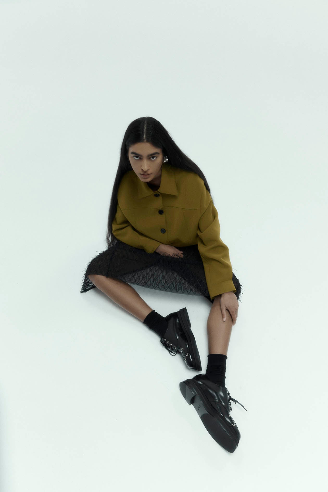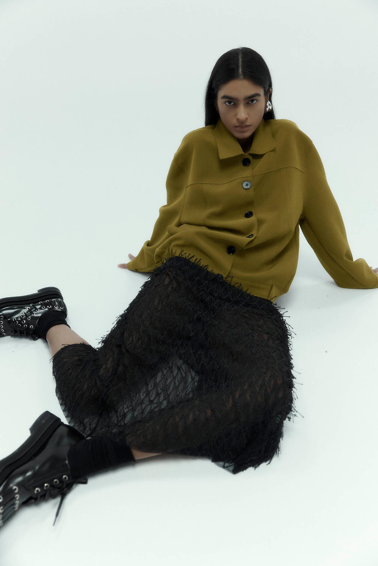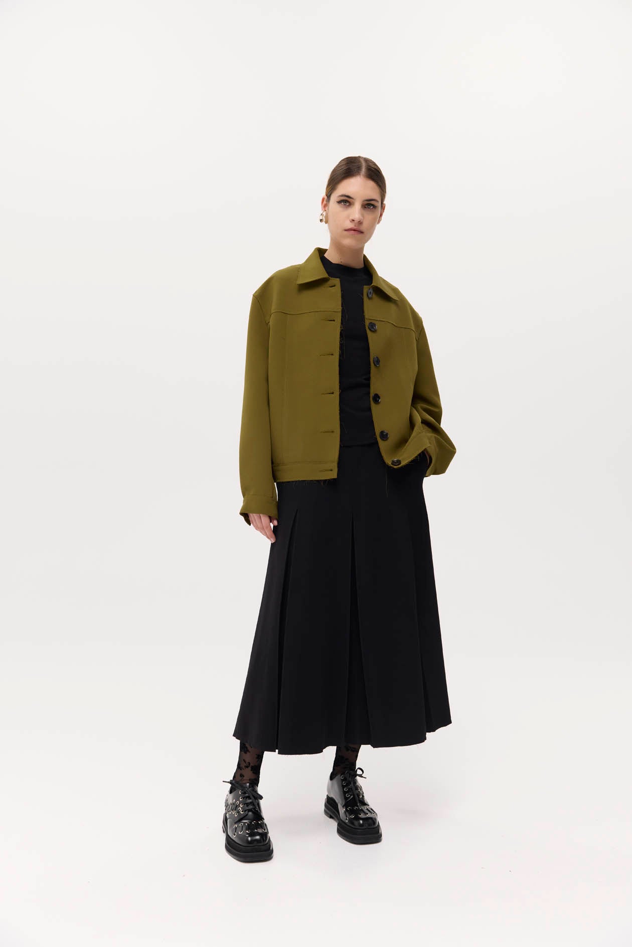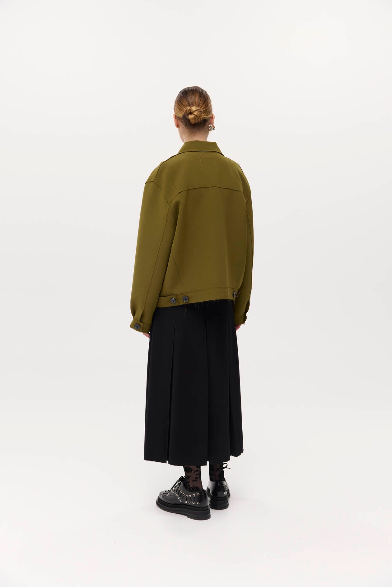 A relaxed cut in structured bay bonded suiting. Referencing western menswear. Cut for a relaxed fit, with raw edge detailing and horn buttons.