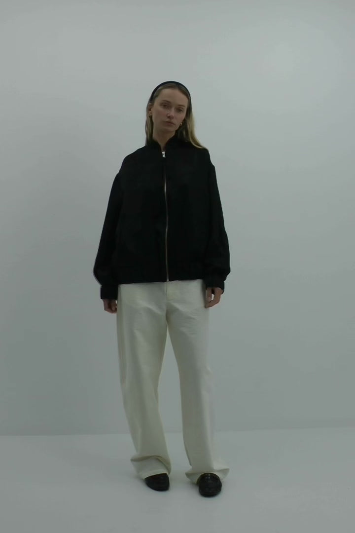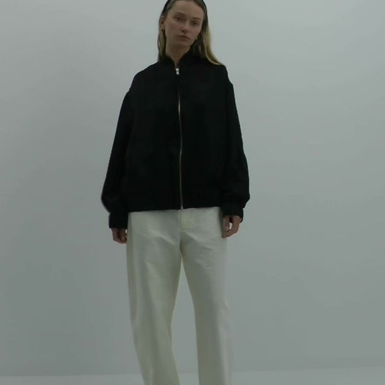 A lightweight bomber cut in black satin jacquard featuring a band collar, front pockets and tassel zip. Fully lined.