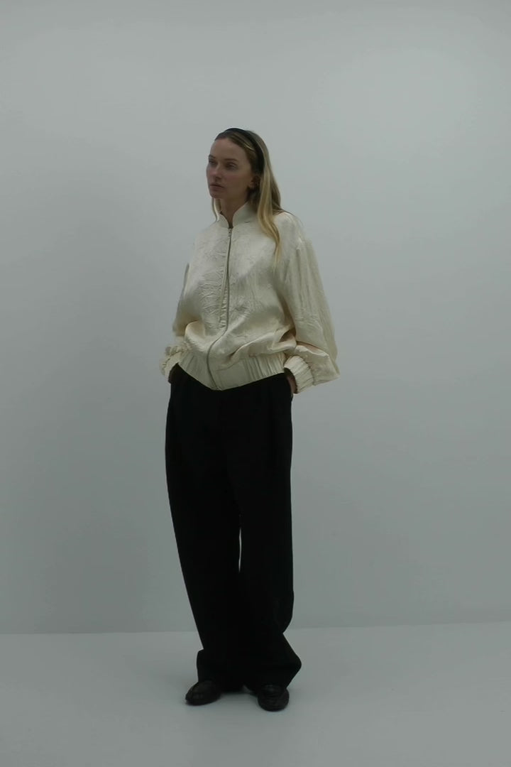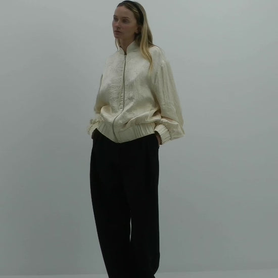 A lightweight bomber cut in black satin jacquard featuring a band collar, front pockets and tassel zip. Fully lined. Fabric is finished with intentional creasing.