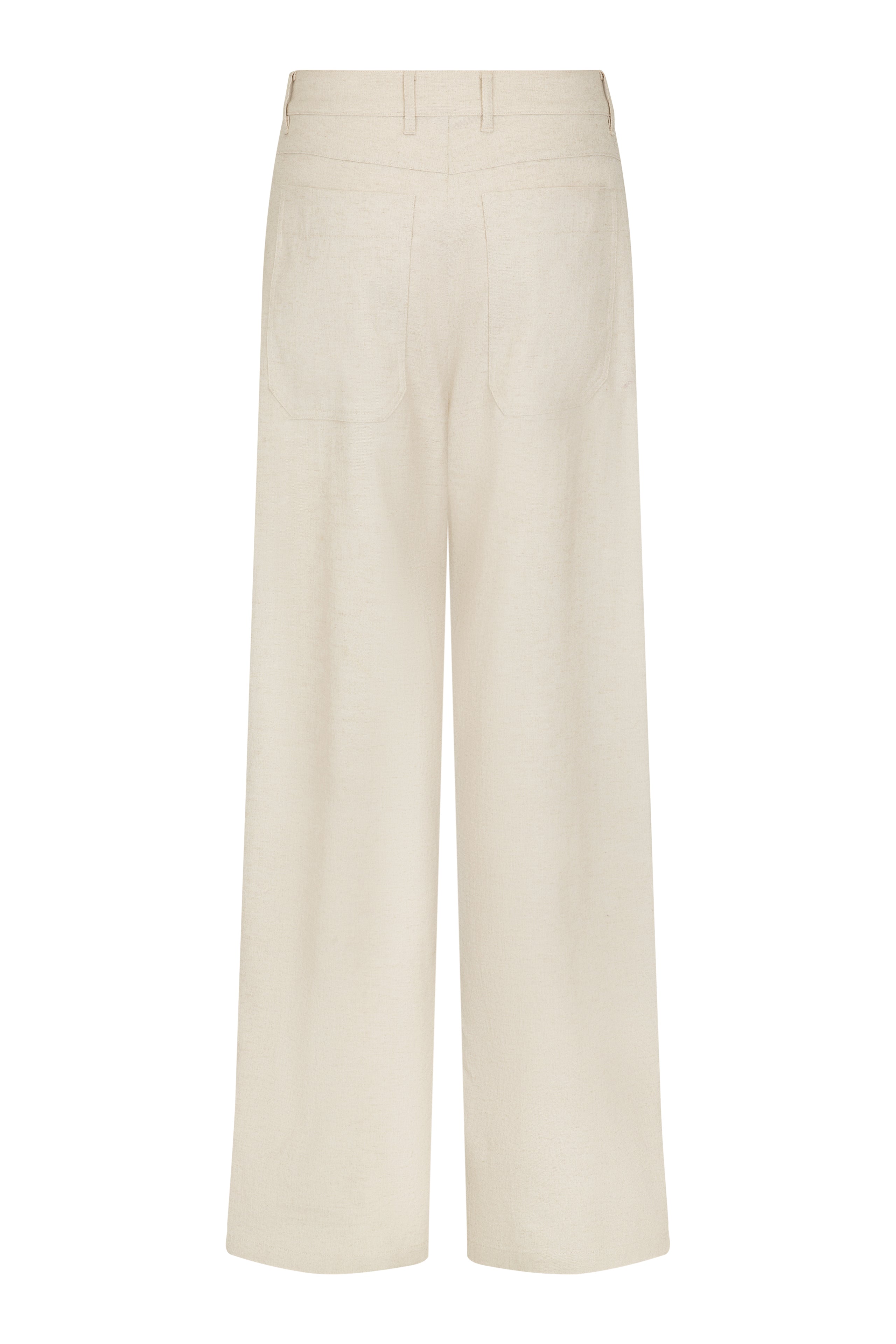 An alternative to the classic jean cut in a relaxed, full-length silhouette in lightweight linen blend summer suiting. Features a mid-rise waist, stitched rounded front pockets and patch back pockets. Finished with a front zip and snap closure.