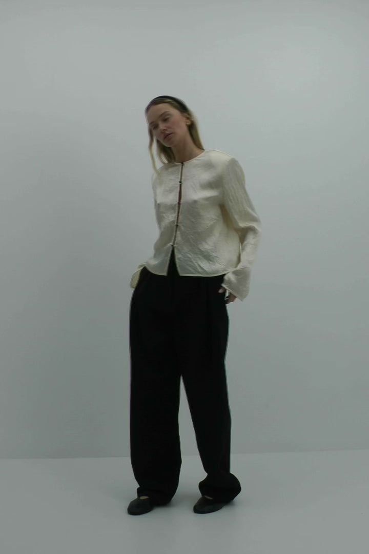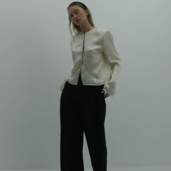 A cropped, long sleeve button-front blouse cut in ivory jacquard satin. Subtle removable shoulder pads lend quiet structure to the fluid silhouette, while the collarless neckline offers paired back elegance.