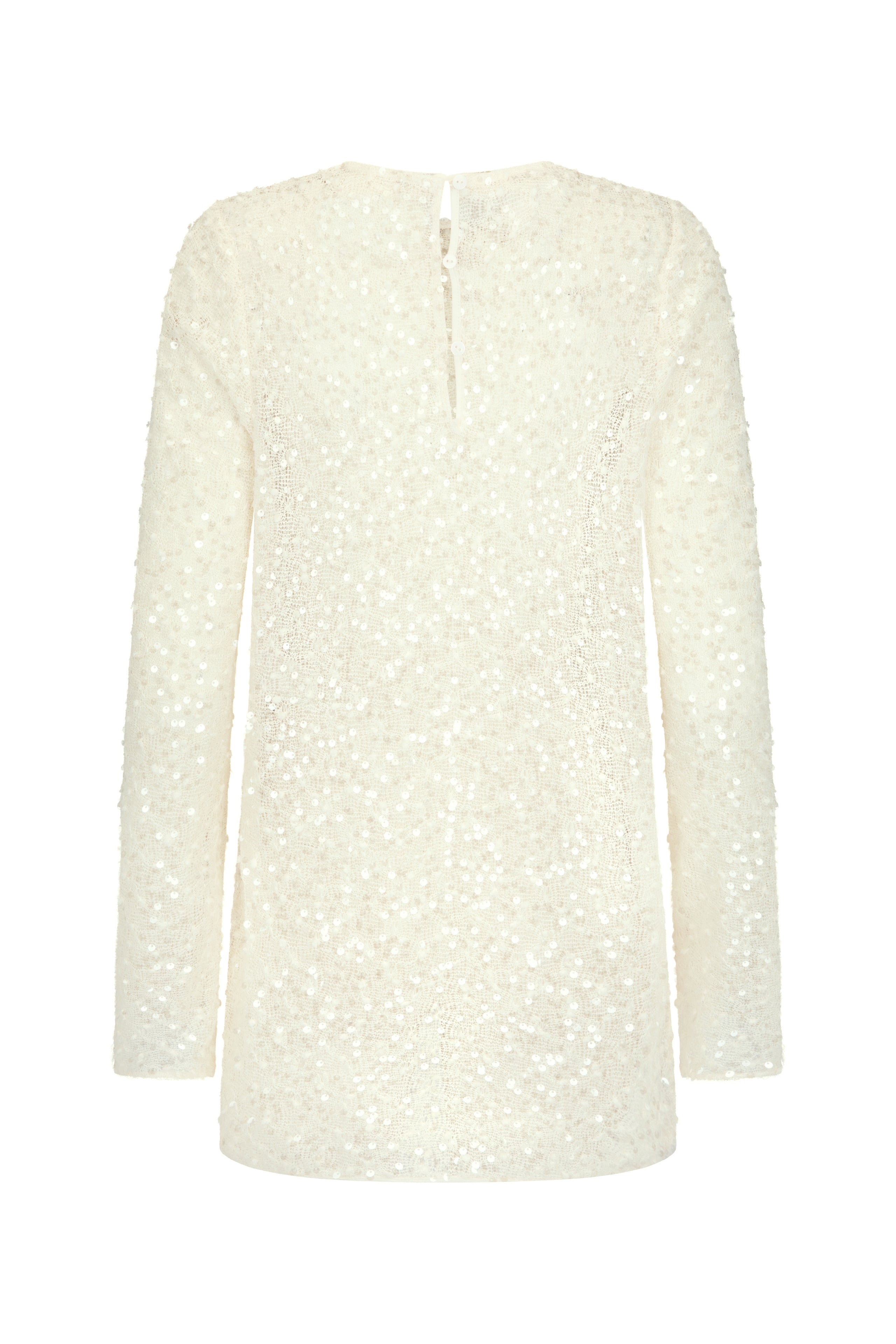 A relaxed silhouette crafted in a sheer sequin knit. Featuring long sleeves and a three button closure at the centre back, this piece offers subtle shimmer with an effortless drape.