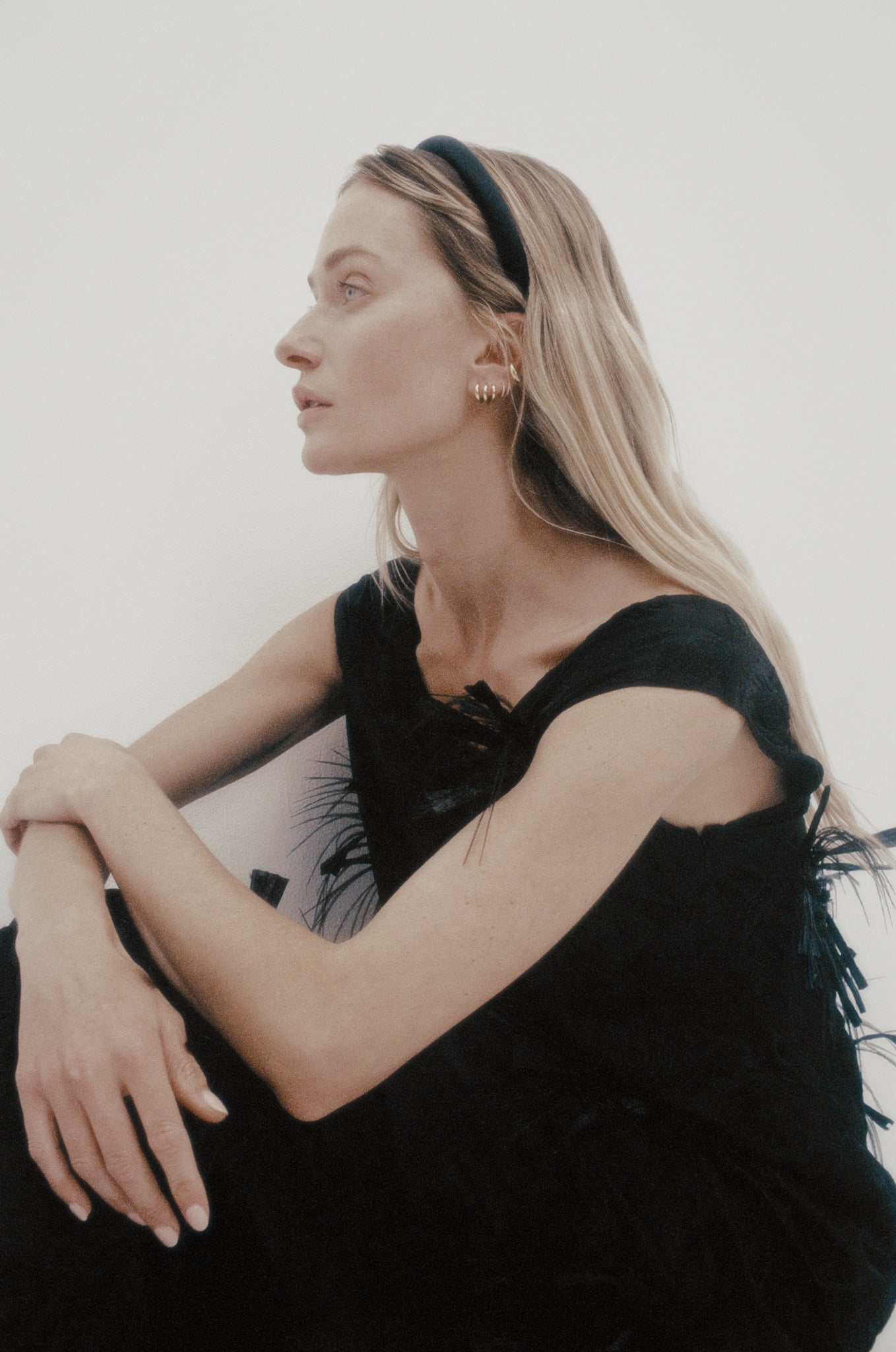 All-over custom embroidery with hand-beaded, feathered floral motifs is cut into a pared-back, sleeveless silhouette with a subtle cocoon shape. A statement piece defined by tactile details against understated form.