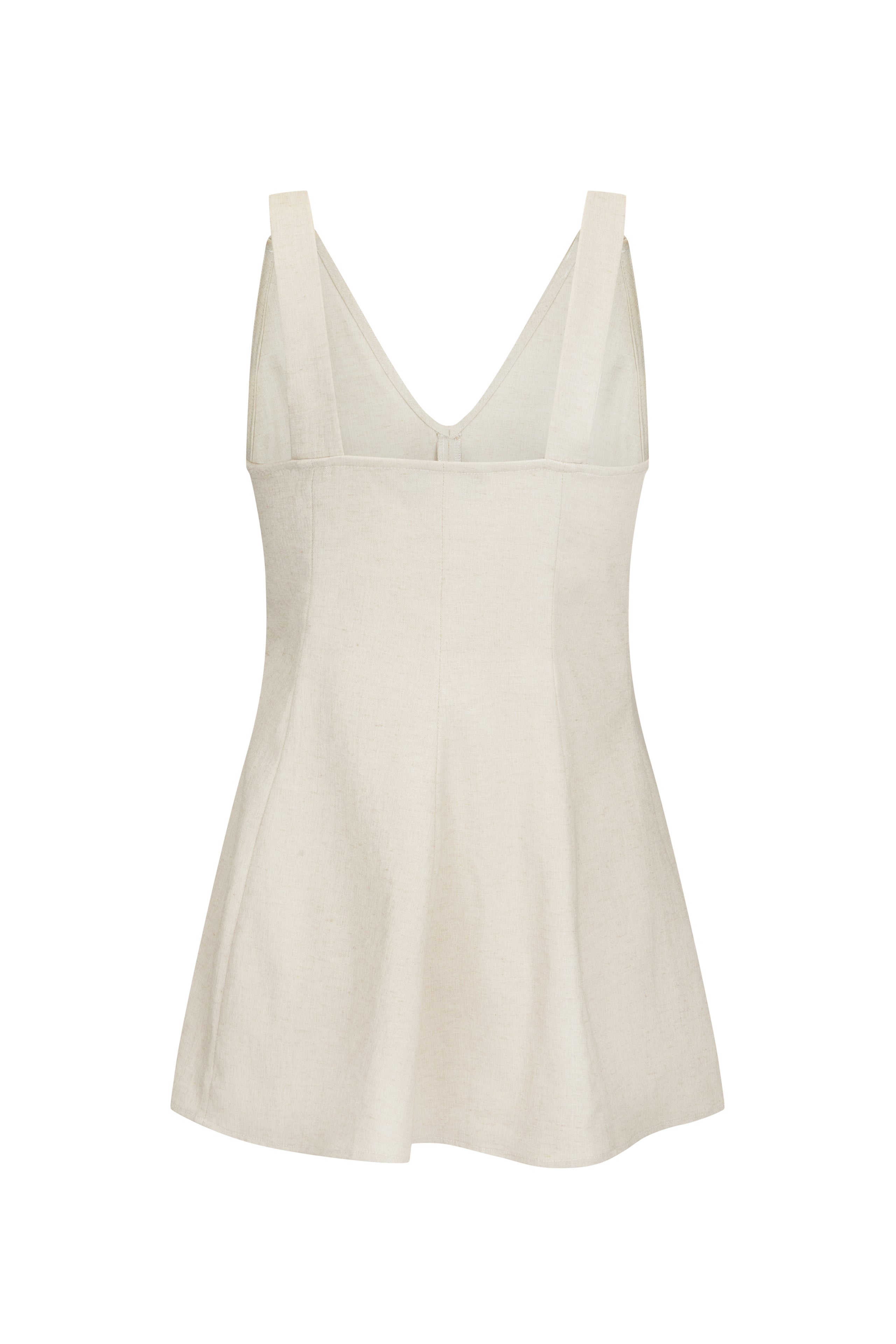 A softly structured silhouette with a fitted bodice that releases at the waist, creating gentle volume through the body. Featuring a V-shaped neckline, this style is cut in lightweight linen blend summer suiting—designed for effortless wear in warmer climates.