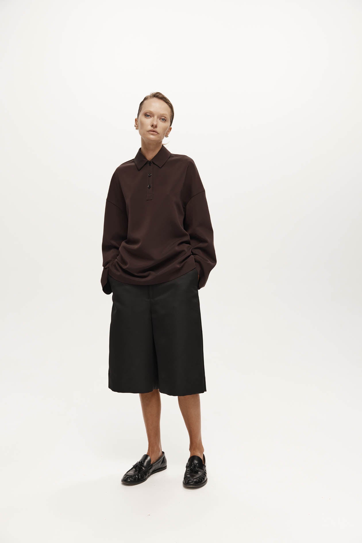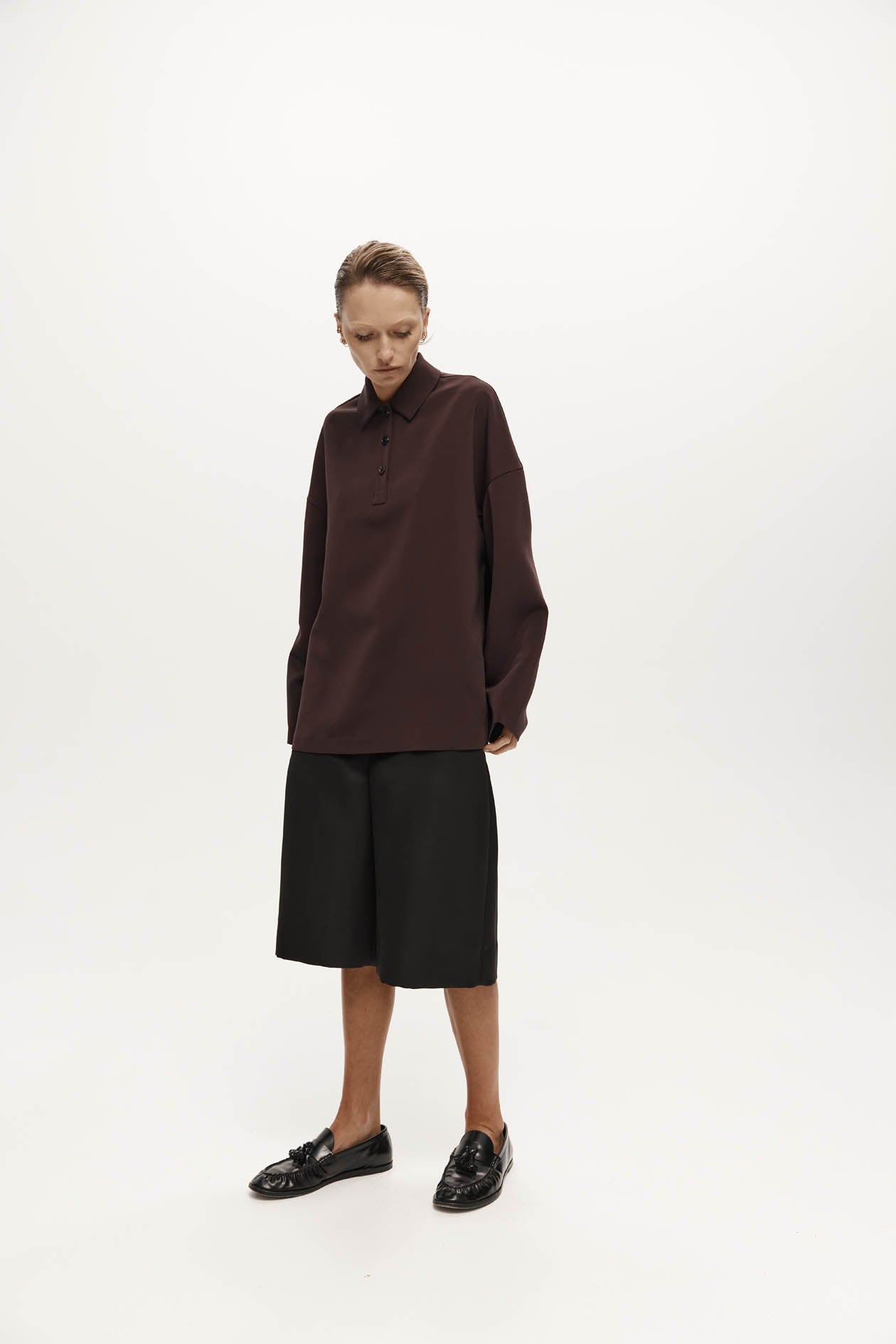 A long sleeve polo cut in a relaxed silhouette. Features a pointed collar, three-button placket, and dropped shoulders. Finished with elongated sleeves and a straight hem.